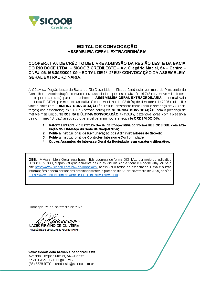 Caro cooperado, confira abaixo o Edital de Convocação para a Assembleia Geral Extraordinária do Sicoob Credileste, que aconteceu de forma digital pelo aplicativo Sicoob Moob.