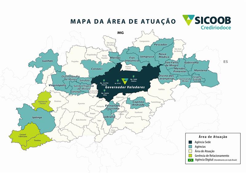 O Sicoob Crediriodoce tem o orgulho de estar presente em 20 cidades, com 23 postos de atendimento físicos, sendo 04 deles no modelo de agência de Negócios.