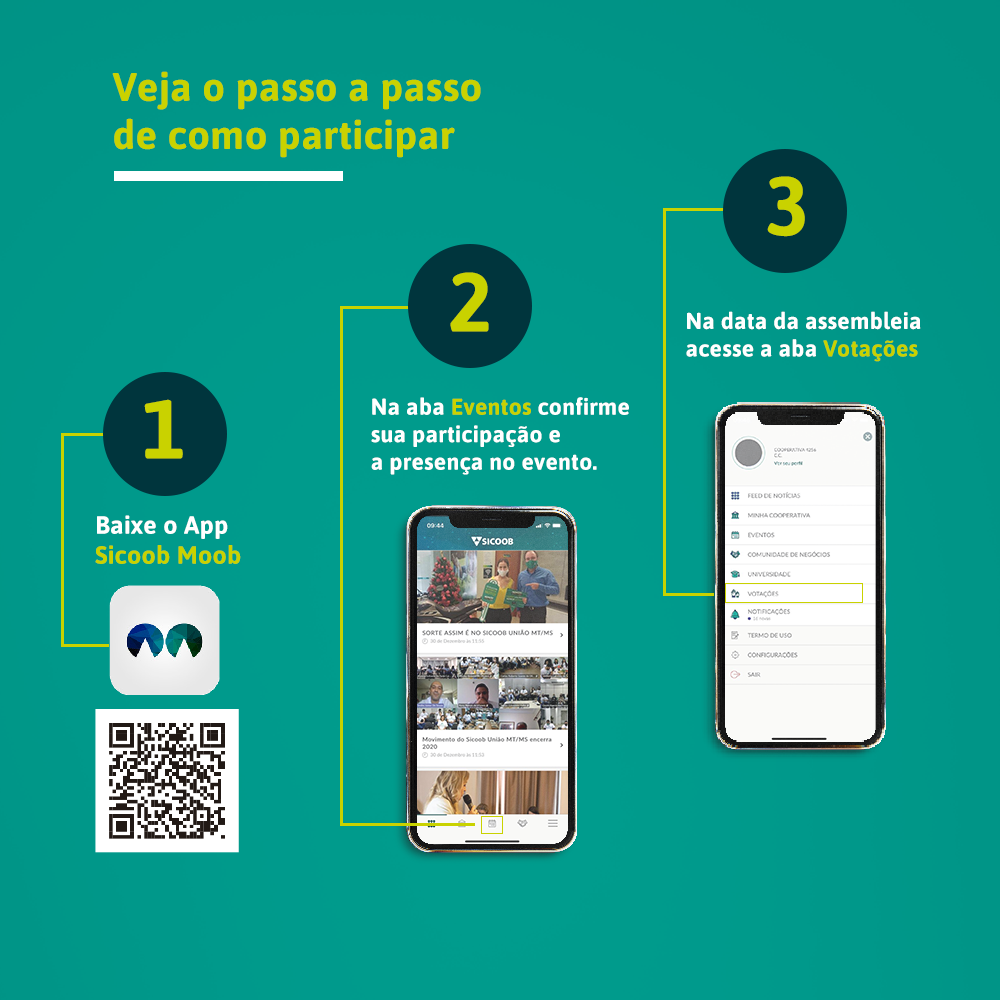 Baixe em seu aparelho celular ou tablete, o aplicativo “Sicoob Moob”, disponível para download, gratuitamente, nas lojas Apple Store e Google Play.