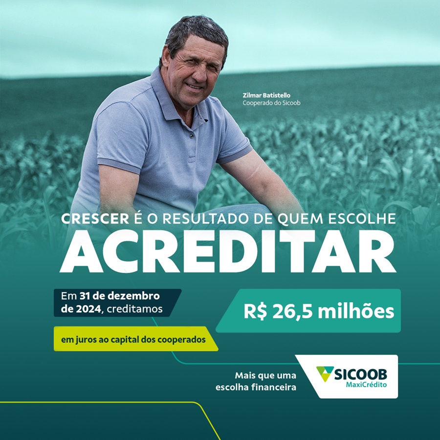 Ser mais que uma escolha financeira é promover um círculo virtuoso de prosperidade. É, através de soluções financeiras justas e competitivas, incentivar o desenvolvimento de pessoas e comunidades e, por meio da proximidade e confiança, ajudar a construir um futuro mais próspero. Com esse propósito, no dia 31 de dezembro de 2024, o Sicoob MaxiCrédito fez o pagamento de mais de R$ 26,5 milhões em Juros ao Capital dos associados.