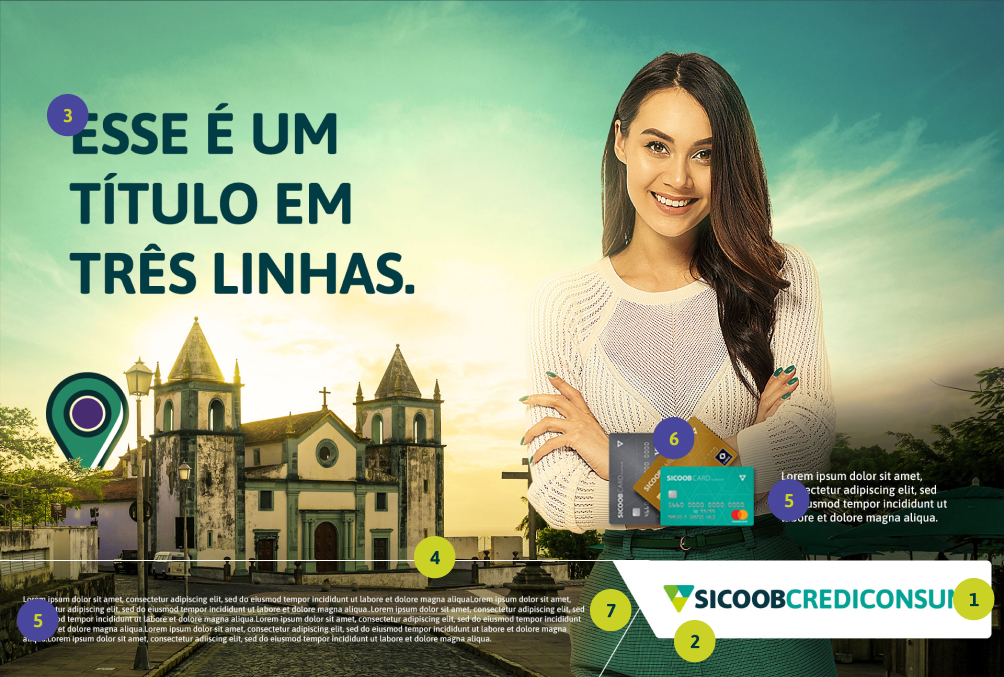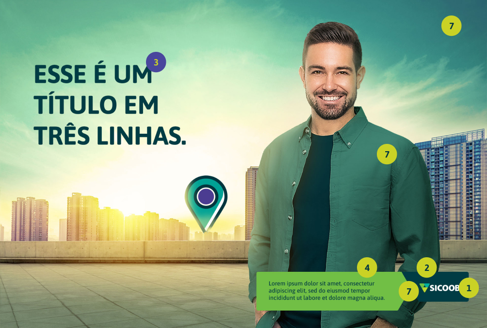 Inspirados no ícone da marca, eles conferem às peças um aspecto final daquilo que é feito pela comunicação do Sicoob. Esse conjunto é composto pelo box que recebe o logotipo e pelo box de informação.