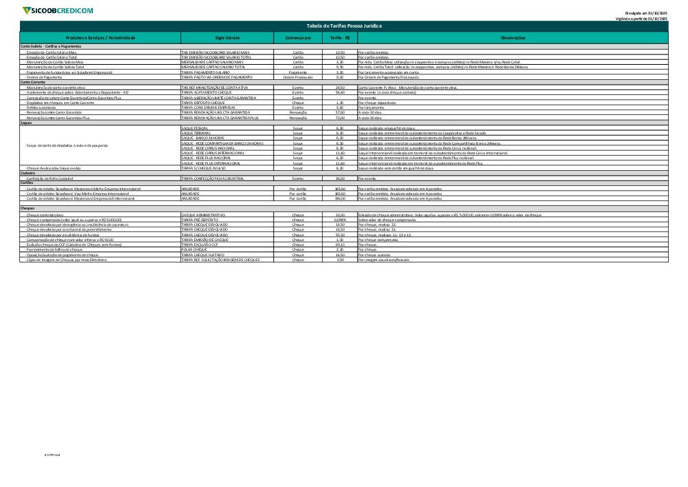 Tabela de Tarifas - Sicoob Credicom