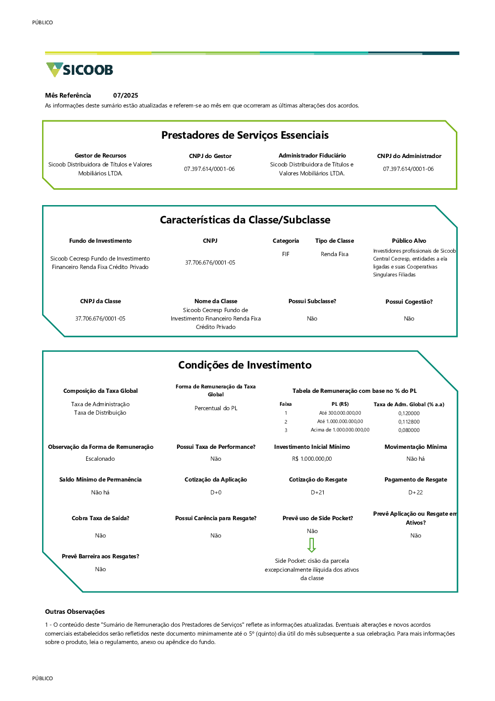 É um fundo destinado a receber aplicações, no segmento de renda fixa, de clientes pessoas físicas e/ou jurídicas do Banco Sicoob e das cooperativas do Sicoob, incluindo regimes próprios de Previdência Social, nos termos da Lei nº 9.717, assim como de quaisquer outros investidores, inclusive Companhias Seguradoras, Sociedades de Capitalização e Entidades Abertas e Fechadas de Previdência Complementar.