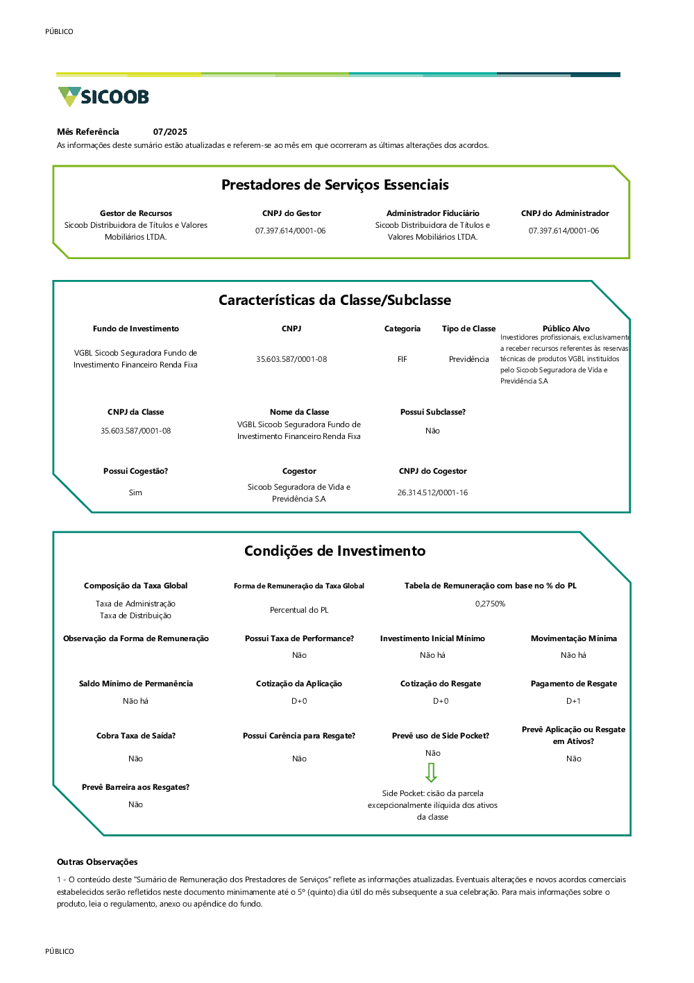 É um fundo destinado a receber aplicações, no segmento de renda fixa, de clientes pessoas físicas e/ou jurídicas do Banco Sicoob e das cooperativas do Sicoob, incluindo regimes próprios de Previdência Social, nos termos da Lei nº 9.717, assim como de quaisquer outros investidores, inclusive Companhias Seguradoras, Sociedades de Capitalização e Entidades Abertas e Fechadas de Previdência Complementar.