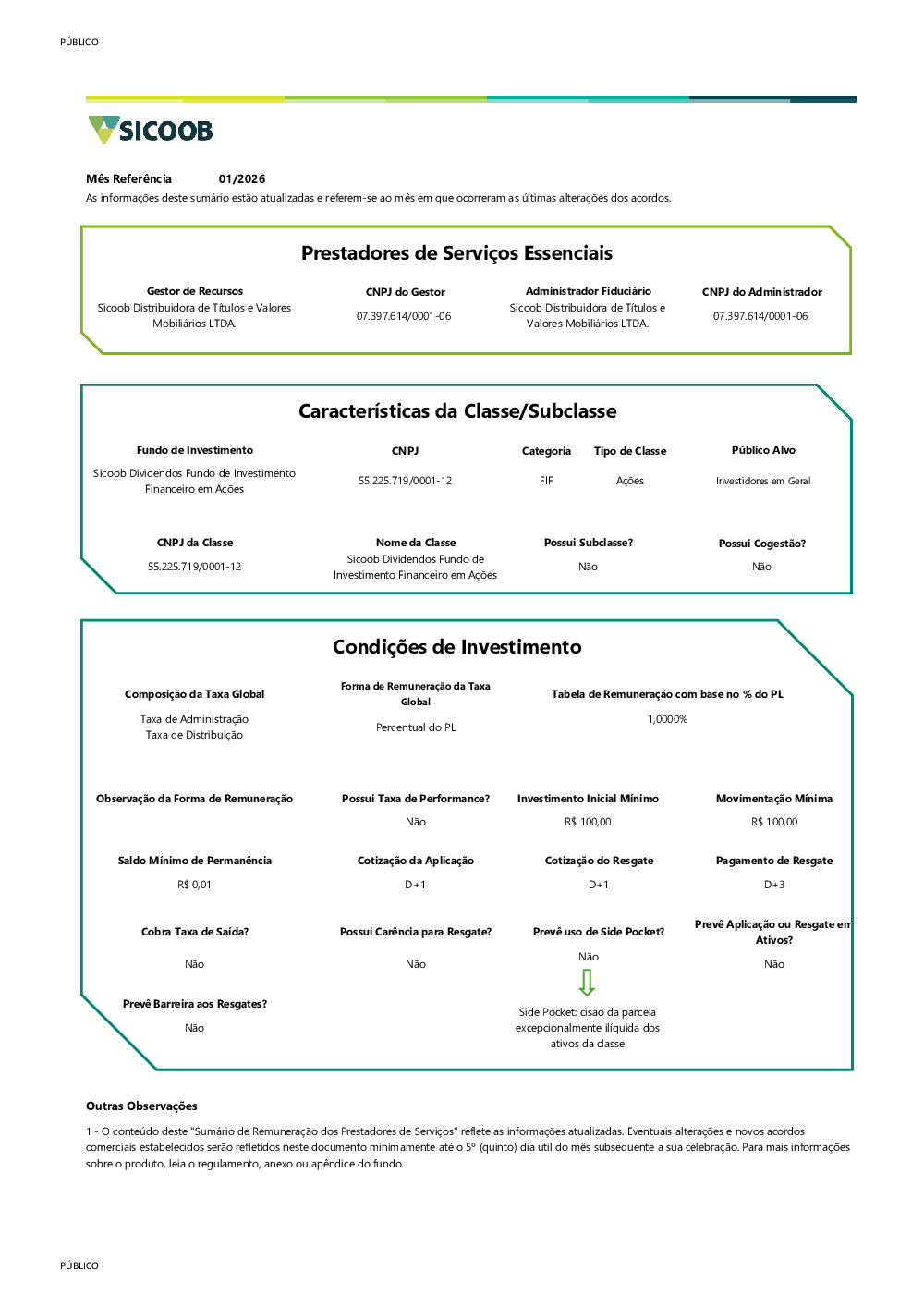 É um fundo destinado a receber aplicações, no segmento de renda fixa, de clientes pessoas físicas e/ou jurídicas do Banco Sicoob e das cooperativas do Sicoob, incluindo regimes próprios de Previdência Social, nos termos da Lei nº 9.717, assim como de quaisquer outros investidores, inclusive Companhias Seguradoras, Sociedades de Capitalização e Entidades Abertas e Fechadas de Previdência Complementar.
