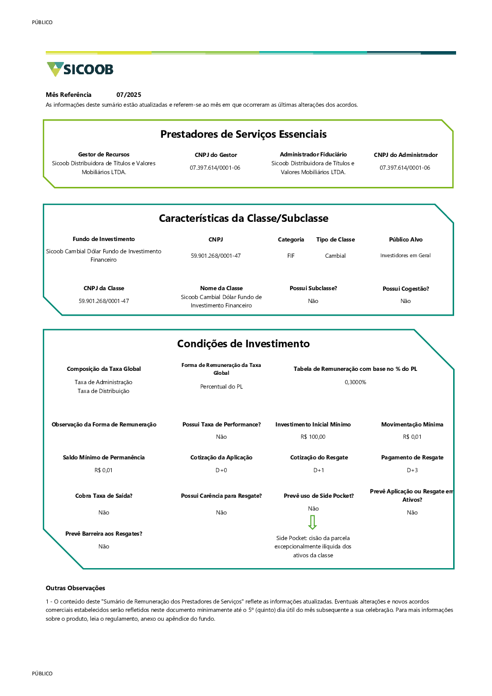 É um fundo destinado a receber aplicações, no segmento cambial, de clientes pessoas físicas e/ou jurídicas do Banco Sicoob e das cooperativas do Sicoob, incluindo às Entidades Fechadas de Previdência Complementar. Indicado para investidores que queiram aplicar em uma carteira com ativos financeiros relacionados diretamente, ou sintetizados via derivativos, à variação de preços do dólar norte-americano e/ou à variação do cupom cambial.