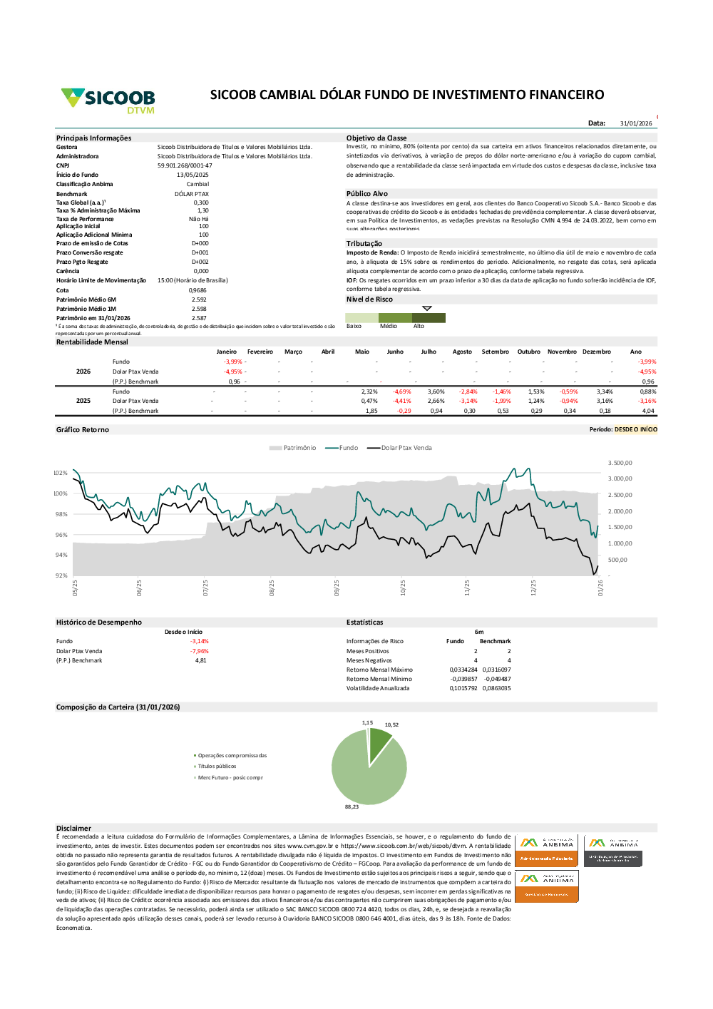 É um fundo destinado a receber aplicações, no segmento cambial, de clientes pessoas físicas e/ou jurídicas do Banco Sicoob e das cooperativas do Sicoob, incluindo às Entidades Fechadas de Previdência Complementar. Indicado para investidores que queiram aplicar em uma carteira com ativos financeiros relacionados diretamente, ou sintetizados via derivativos, à variação de preços do dólar norte-americano e/ou à variação do cupom cambial.