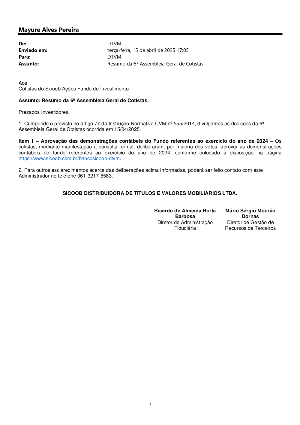 É um fundo destinado a receber aplicações, no segmento de renda variável, de clientes pessoas físicas e/ou jurídicas do Banco Sicoob e das cooperativas do Sicoob, incluindo às Entidades Fechadas de Previdência Complementar. É indicado para investidores que possuem, como objetivo, o investimento em empresas sustentáveis. A metodologia de investimento adotada para seleção e ponderação de ativos considera a avaliação das práticas de gestão de aspectos sociais, ambientais e/ou de governança corporativa.