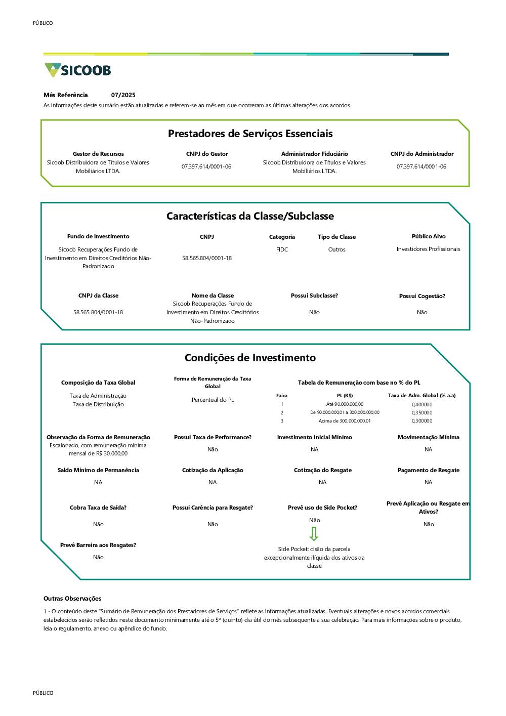 É um fundo destinado a receber aplicações, no segmento de renda fixa, de clientes pessoas físicas e/ou jurídicas do Banco Sicoob e das cooperativas do Sicoob, incluindo regimes próprios de Previdência Social, nos termos da Lei nº 9.717, assim como de quaisquer outros investidores, inclusive Companhias Seguradoras, Sociedades de Capitalização e Entidades Abertas e Fechadas de Previdência Complementar.