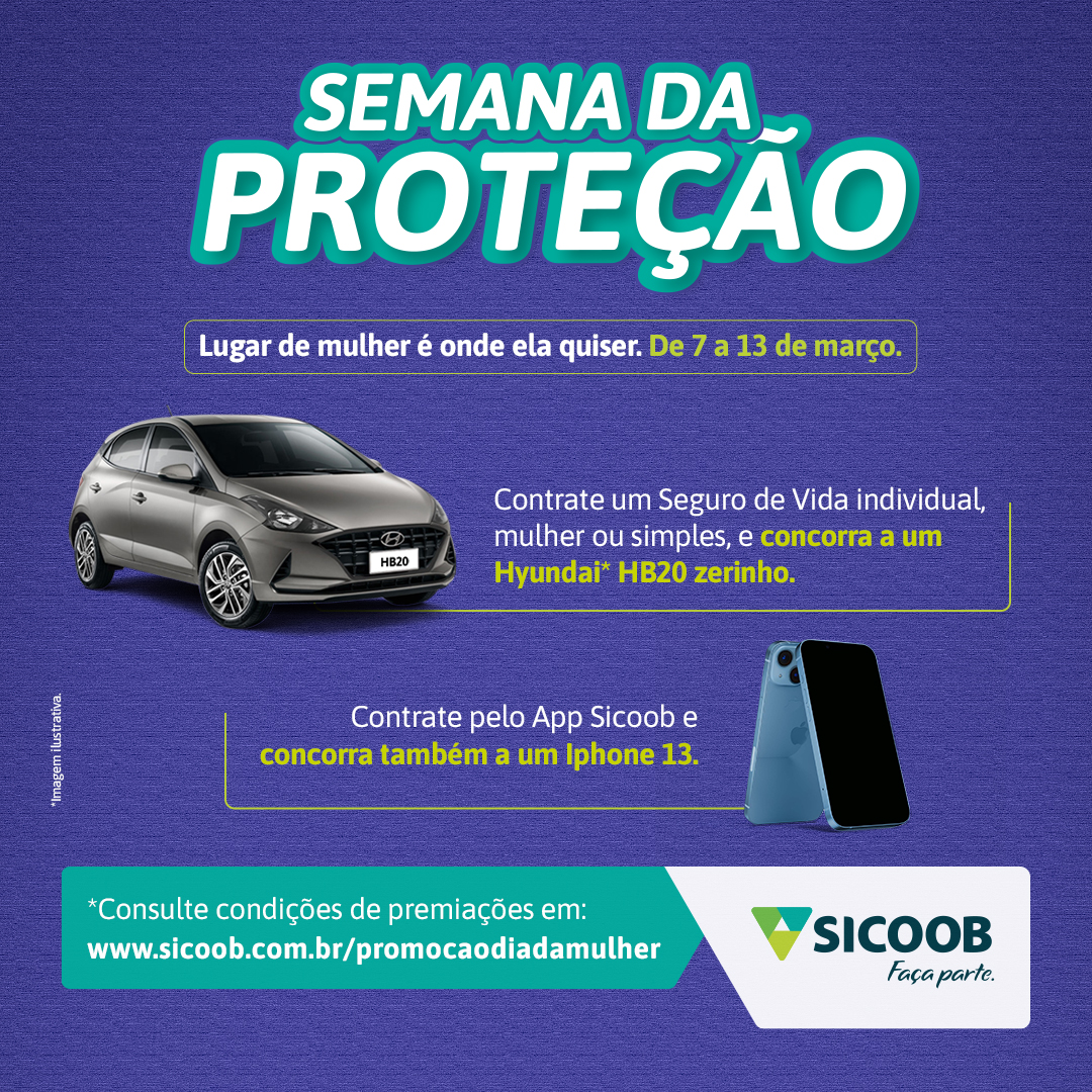 A campanha “Semana da Proteção - Lugar de mulher é onde ela quiser” também irá sortear um IPhone 13 entre as pessoas que contratarem um dos seguros pelo App Sicoob.