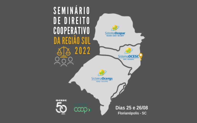 O 6º Seminário de Direito Cooperativo da Região Sul já tem data para ser realizado. Será nos dias 25 e 26 de agosto, em Florianópolis. Após dois anos no formato on-line, em 2022 o evento volta a ser realizado de forma presencial, sob organização do Sistema Ocesc e apoio dos Sistemas Ocepar e Ocergs.
