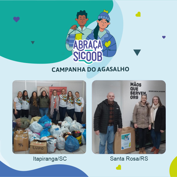 O Sicoob Creditapiranga promoveu entre os dias 25 de abril e 27 de maio, em parceria com o Instituto Sicoob e a Central SC/RS a campanha Abraça Sicoob, edição 2022. A campanha foi realizada nas agências de Itapiranga (SC) e Santa Rosa (RS), e teve como objetivo a arrecadação de agasalhos, roupas e calçados. Através dos pontos de coleta foram arrecadadas mais de 1.100 peças, doadas para entidades assistenciais.