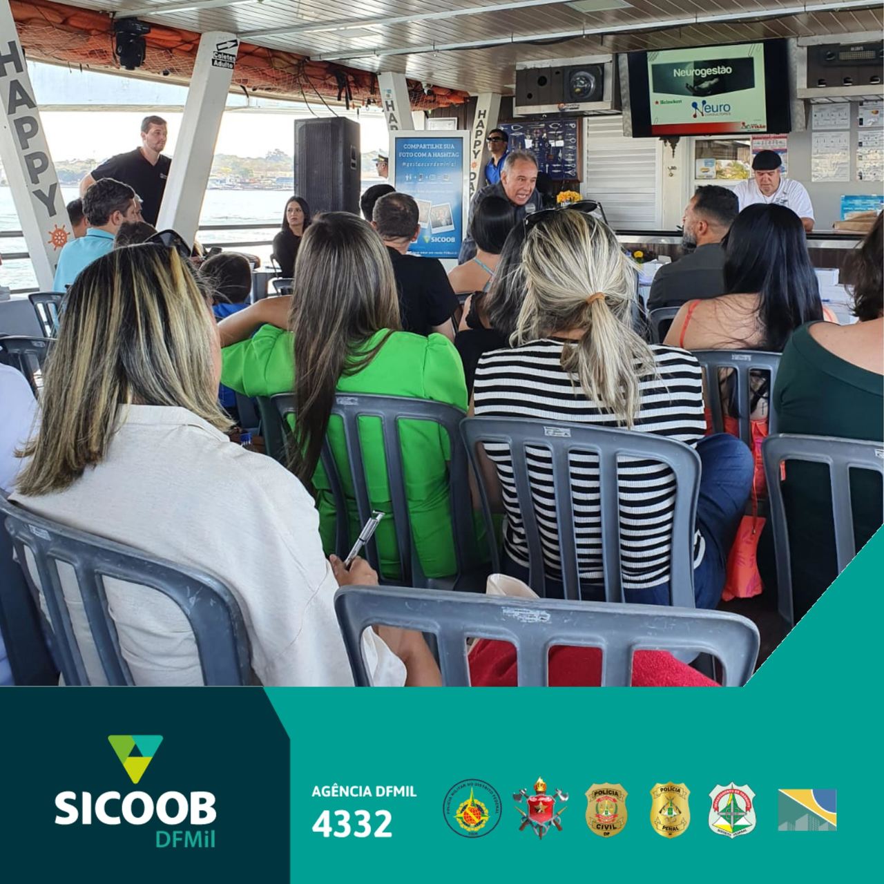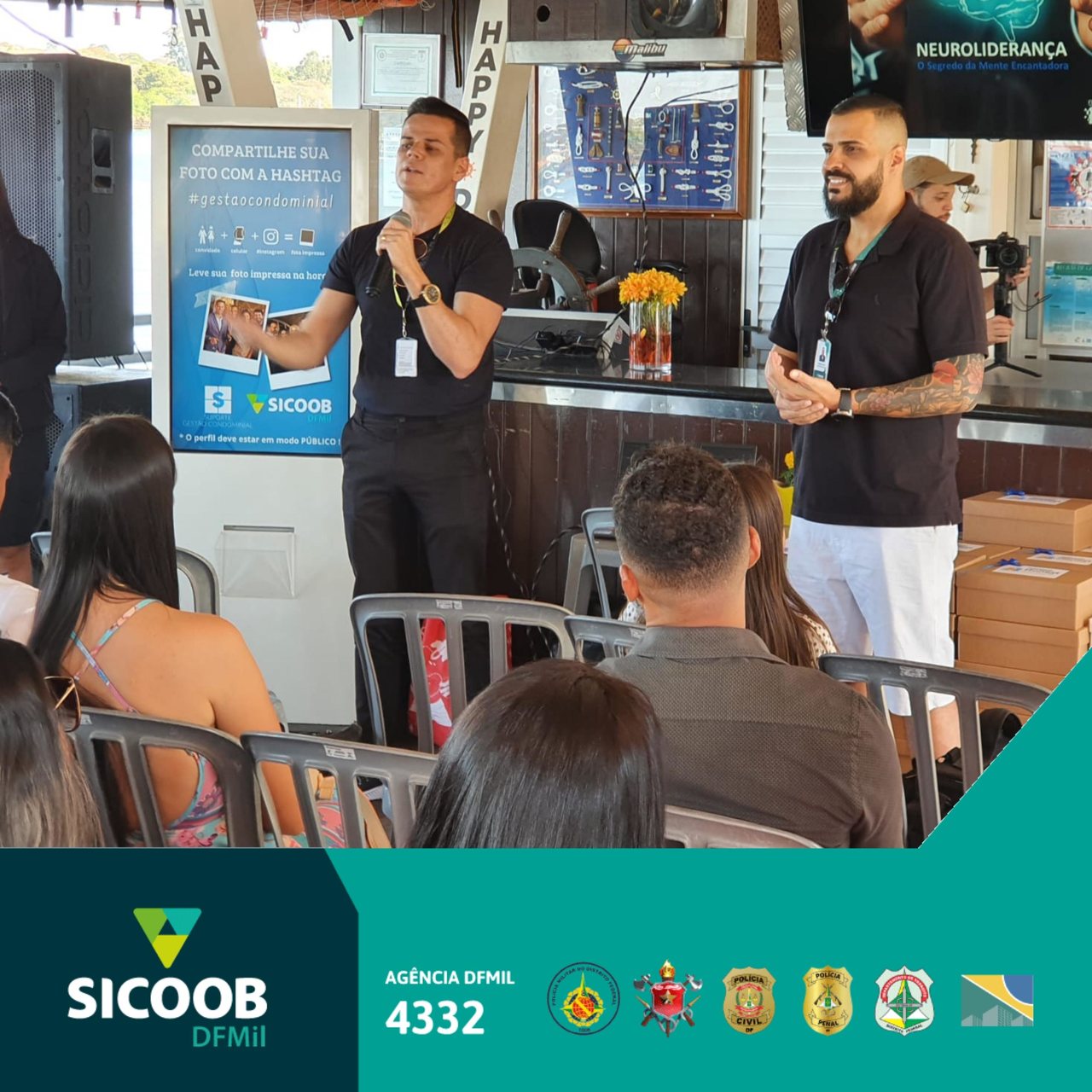 O Sicoob DFMil, representado pelo Bernardo Santana (Gerente Geral) e pelo Marcelo Reis (agente de atendimento), esteve presente na 1ª edição de O Farol, um encontro diferenciado que reuniu síndicos a bordo do barco Happy Day.