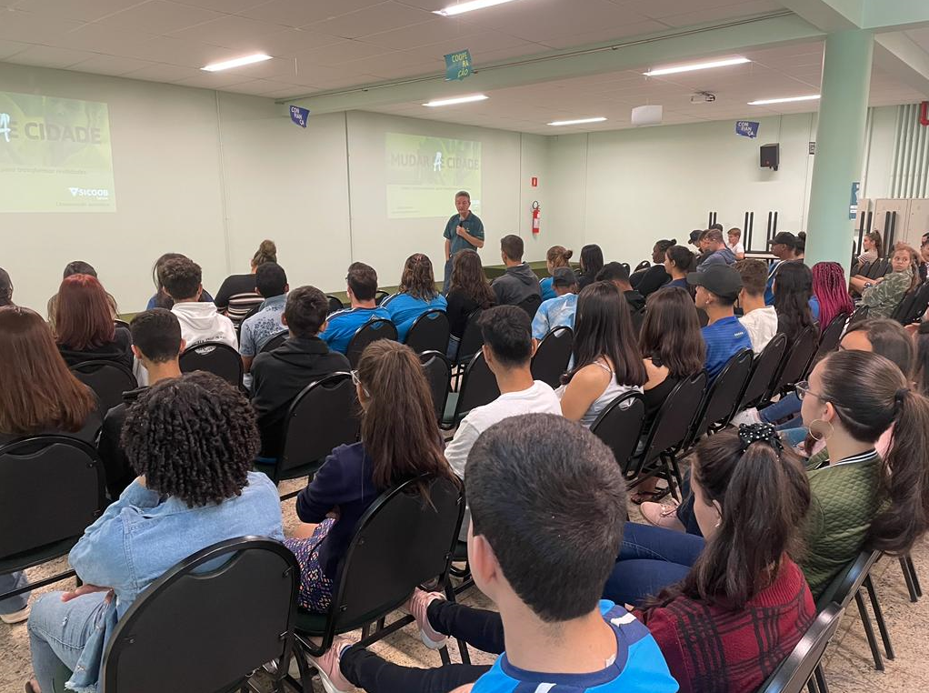Para promover uma reflexão sobre as futuras oportunidades no mercado de trabalho, a convite das escolas, o presidente do Sicoob Sarom, João Carlos Leite (Joãozinho) apresentou nesta terça-feira (23/08), uma palestra sobre empreendedorismo social para alunos do 1° ao 3° ano do ensino médio.