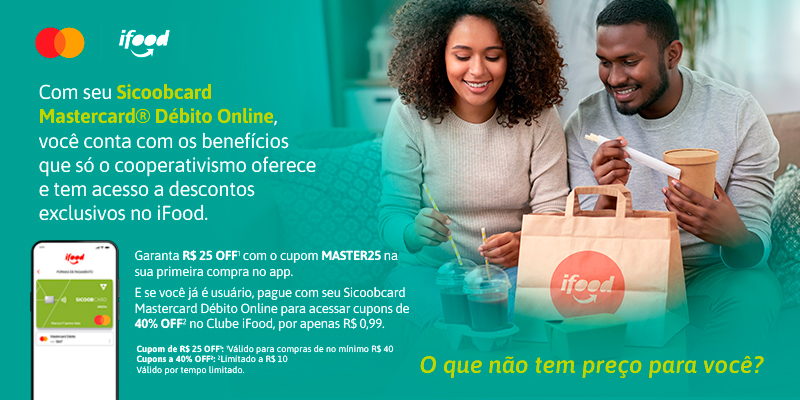 Com a funcionalidade, disponível a partir do dia 20 de setembro, serão dois tipos de benefícios: cupom de R$ 25 reais de desconto no primeiro pedido pelo iFood (com valor mínimo R$ 40,00); e, para cooperados que já são usuários do iFood, cupons de 40% OFF por apenas R$ 0,99 no Clube iFood (desconto limitado a R$ 10,00). Além de usufruir da ação com o uso do cartão de débito virtual, os cooperados portadores do Sicoobcard Mastercard Débito terão mais facilidade e praticidade no momento de finalizar o pedido.