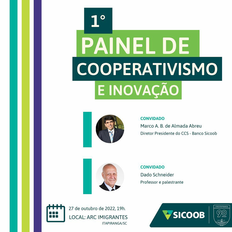 O Sicoob Creditapiranga comemora 90 anos em 2022 e por isso vem promovendo vários eventos e iniciativas para valorizar quem faz parte dessa história – principalmente os cooperados. No dia 27 de outubro a cooperativa realizou o 1° Painel de Cooperativismo e Inovação, tendo como palestrantes o diretor-presidente do Banco Sicoob, Marco Aurélio de Almada Abreu e o professor Dado Schneider.