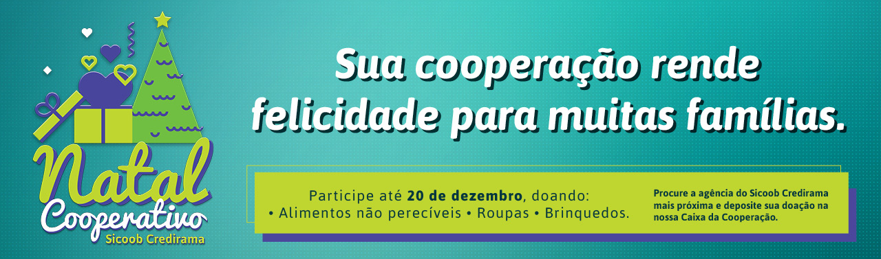 Pensando nisso, o Sicoob Credirama lançou a campanha Natal Cooperativo, que tem como objetivo as arrecadações de alimentos, roupas e brinquedos em prol das comunidades.