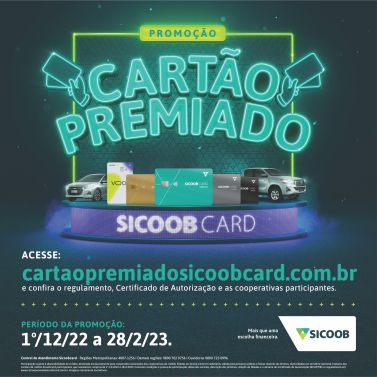 Está em vigência a tradicional campanha de cartões do Sicoob Central Crediminas , a promoção Cartão Premiado Sicoobcard! Até 28/2/2023 o cooperado que utilizar o cartão Sicoobcard nas funções crédito e débito participa automaticamente da iniciativa, concorrendo a três automóveis 0 KM, sendo dois Chevrolet Ônix e uma Toyota Hilux. A cada R$ 100 em compras, o associado recebe um número da sorte e os valores transacionados na Sipag são computados em dobro. Saiba mais em www.cartaopremiadosicoobcard.com.br