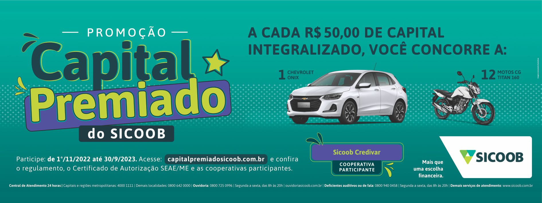Participar de uma cooperativa financeira, com taxas e juros mais competitivas do que os praticados por instituições financeiras tradicionais e ainda concorrer a prêmios são algumas das vantagens oferecidas pelas cooperativas do Sicoob. Com a promoção CAPITAL PREMIADO DO SICOOB, os associados de singulares filiadas ao Sicoob Central Crediminas, das quais fazem parte os associados do Sicoob Credivar, podem concorrer a 12 motos modelo CG Titan 160 e um carro Chevrolet Onix zero KM.