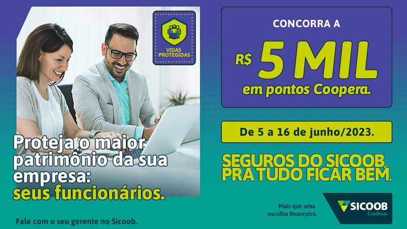O Sicoob iniciou no dia 5 de junho, com uma campanha especial, uma ação para a contratação do Seguro Vida Empresarial. A ação, que prossegue até o dia 16 de junho, tem como objetivo fortalecer a proteção e estimular os cooperados PJ a aderirem a esse serviço, que proporciona tranquilidade e confiança aos proprietários e gestores das empresas.