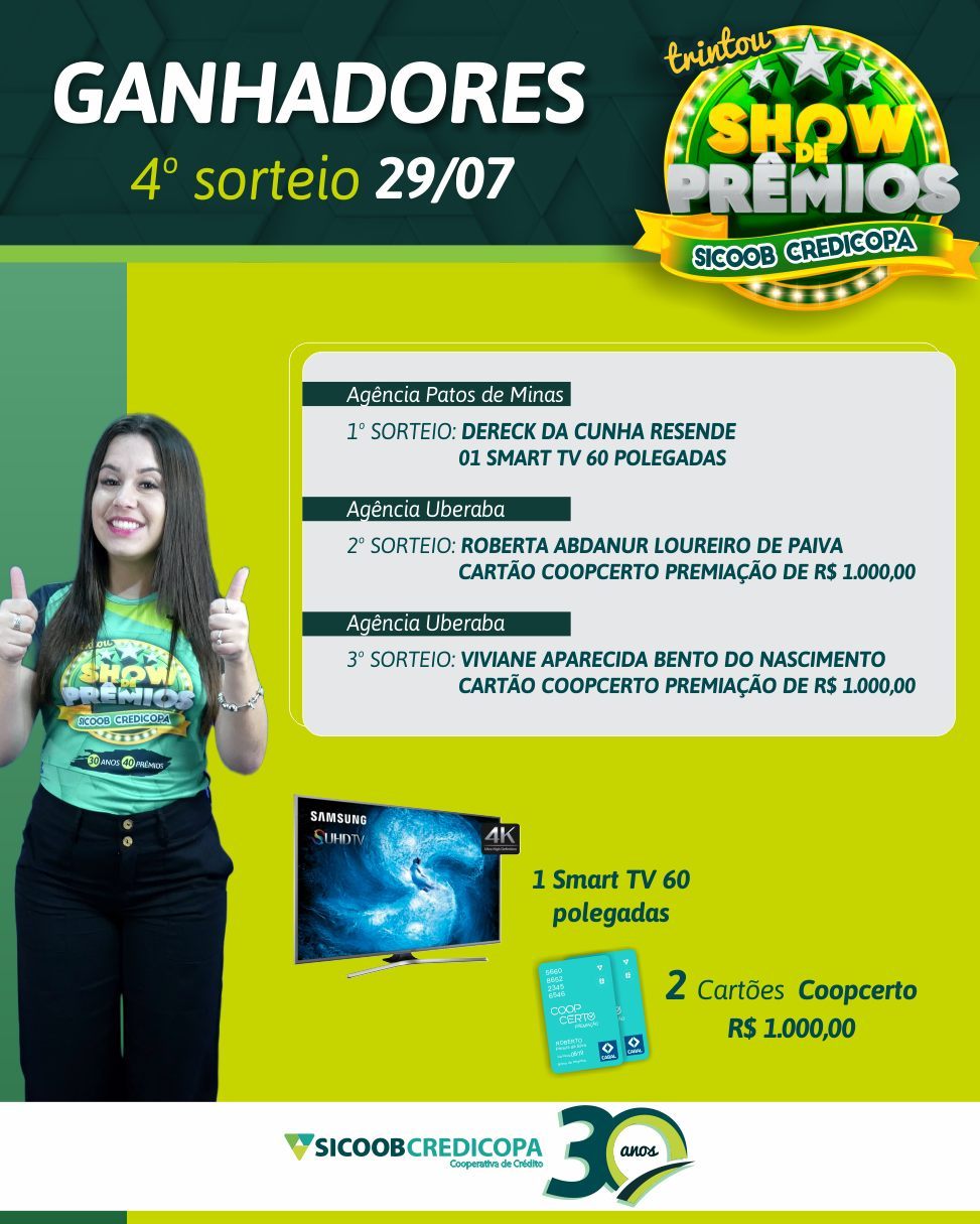 Confira quem foram os ganhadores do quarto sorteio, da campanha Trintou Show de Prêmios do Sicoob Credicopa, em comemoração aos 30 anos da cooperativa.