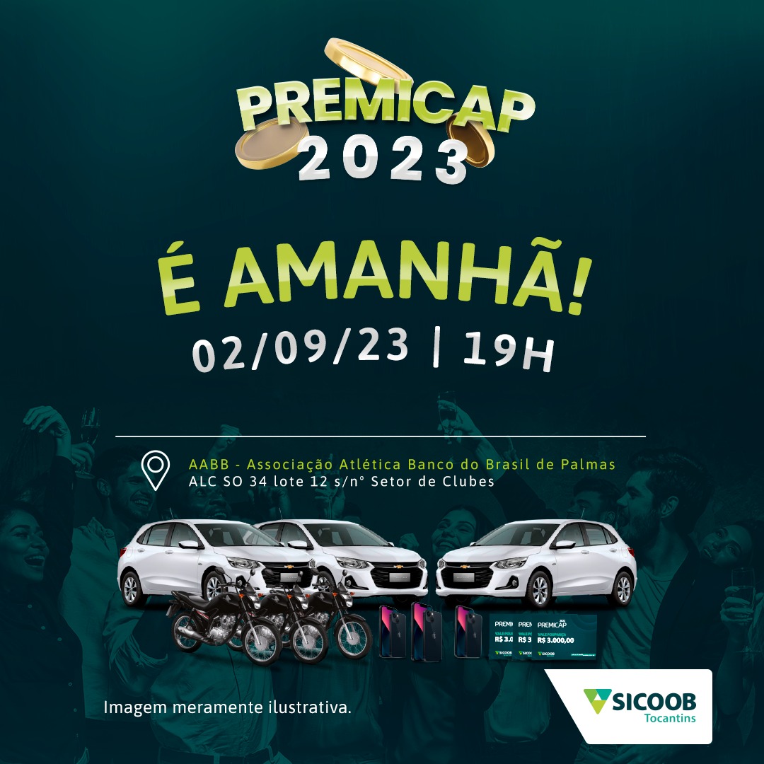 O Sicoob Tocantins promove neste sábado a tradicional festa de premiação da maior campanha de capitalização premiada do Estado. A Premicap 2023, que reunirá titulares e seus convidados, será realizada na AABB, em Palmas. Serão sorteados entre os 600 cooperados do Sicoob Tocantins que adquiriram a Premicap, três automóveis Onix 1.0, três motos 160 cc, três Iphones 14 Pro e três poupanças Sicoob de R$ 3 mil cada.