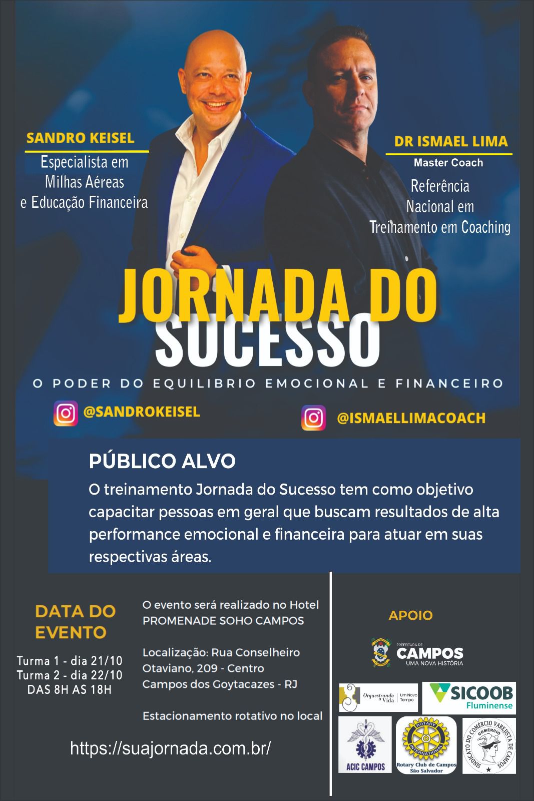 A Jornada de Sucesso será conduzida por Sandro Keisel, especialista em Milhas Aéreas e Educação Financeira, e pelo Dr. Ismael Lima, referência nacional em Treinamento e Coaching.
