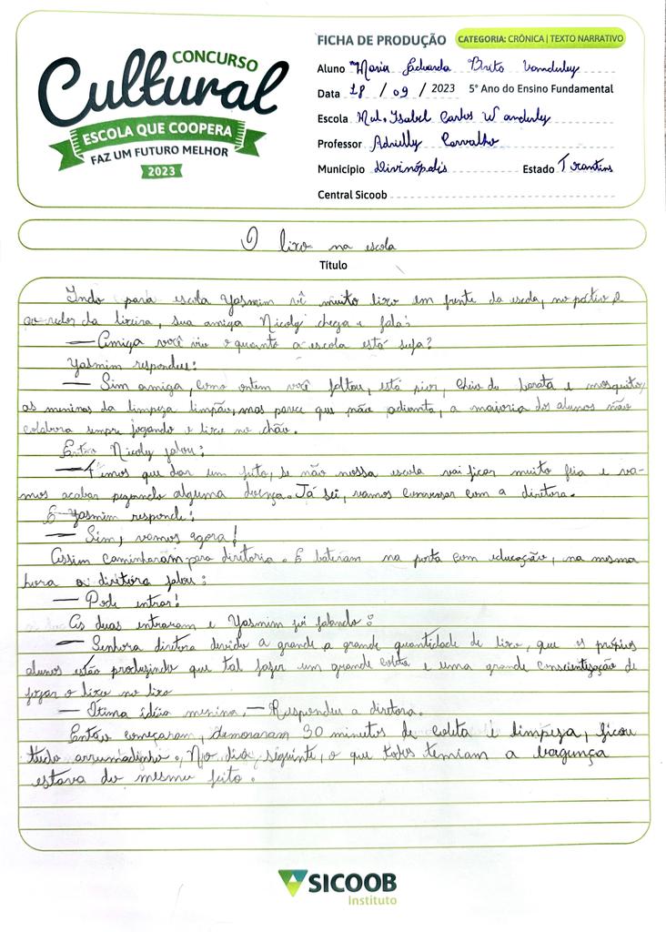 Na crônica, foram selecionadas as alunas: Maria Eduarda Brito Vanderley, da Escola Municipal Isabel Carlos Wanderley, em Divinópolis; Mariana Emanuelle Rocha Bezerra e Maria Esther Bezerra de Carvalho Mendes, ambas da Rede de Ensino Propósito, em Paraíso do Tocantins.