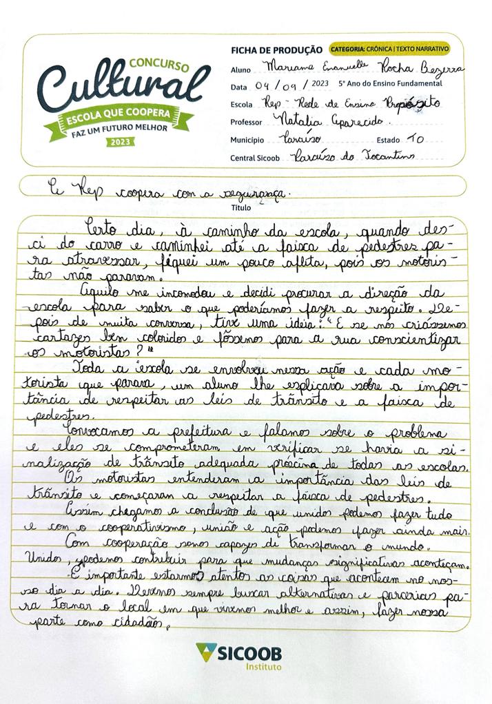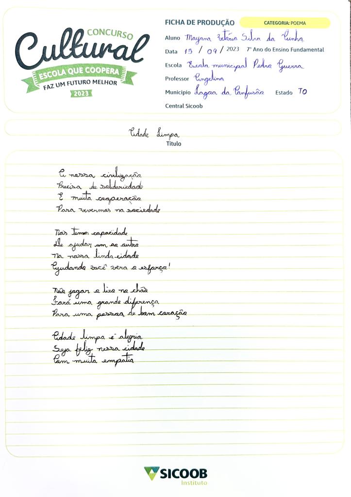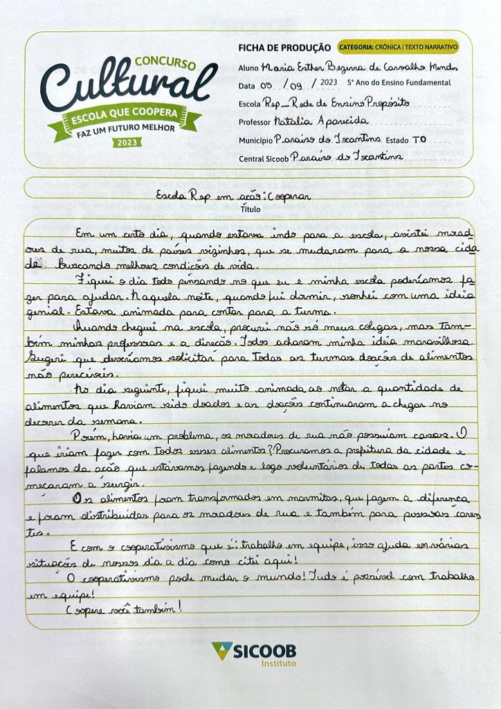 No Tocantins, participaram desta 12ª edição do concurso, estudantes do 3º, 5º, 7º e 9º ano do ensino fundamental da Escola Estadual Paulina Câmara, Barrolândia; Colégio Militar do Tocantins Diaconízio Bezerra da Silva, REP Rede de Ensino Propósito e Escola Estadual Cívico Militar São José Operário, em Paraíso do Tocantins; Colégio Estadual Conceição Brito, em Fátima; Escola Municipal Pedro Guerra, em Lagoa da Confusão; REP Rede de Ensino Propósito, em Colinas; Escola Municipal Anne Frank, em Palmas; Escola Municipal Prof. José Ribamar Barbosa, Colégio Estadual João Dias Sobrinho, Escola Estadual Dona Cândida de Freitas, Escola Municipal Isabel Carlos Wanderley, em Divinópolis e Escola Municipal Dona Lindaura de Oliveira Moraes, no município de Pium. (Ascom Sicoob Tocantins, com informações do Instituto Sicoob)