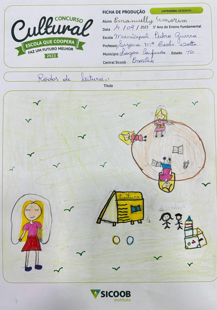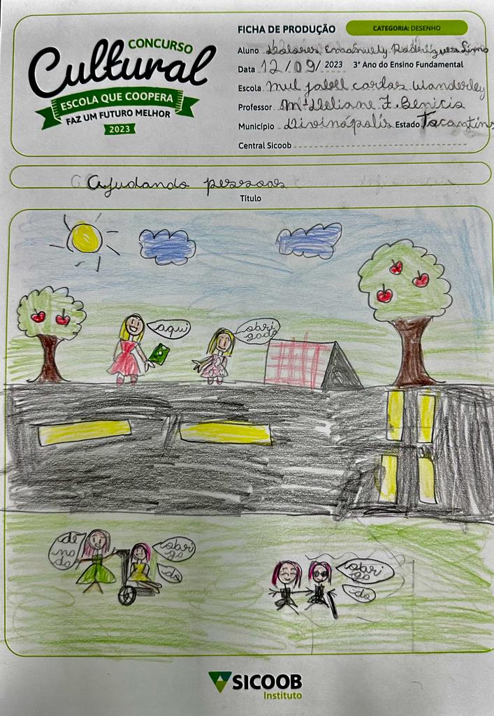Na categoria desenho, os finalistas da etapa local foram as estudantes: Dolores Emanuely Rodrigues Lima, da Escola Municipal Isabel Carlos Wanderley, em Divinópolis; Maria Valenttyna C. de Sá, da Rede de Ensino Propósito, em Colinas do Tocantins e Emanuelly Amorim, da Escola Municipal Pedro Guerra, em Lagoa da Confusão.