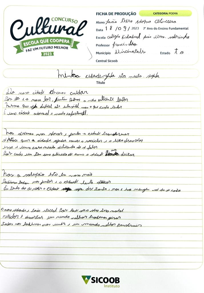 Os escolhidos na categoria poema foram: Mayana Vitoria Silva da Cunha, da Escola Municipal Pedro Guerra, em Lagoa da confusão; João Pedro Adorno Oliveira e Carla Estefany da Silva Dias, estudantes do Colégio Estadual João Dias Sobrinho, em Divinópolis.