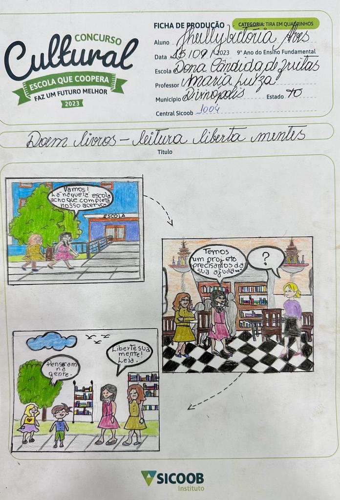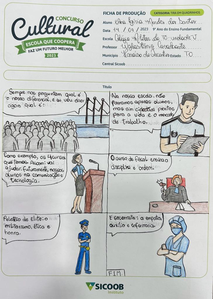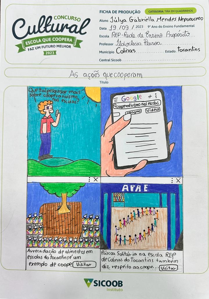 E na tira em quadrinhos, foram classificadas: Julya Gabriella Mendes Neponuceno, da Rede de Ensino Propósito, em Colinas; Jhully Victoria Alves, da Escola Estadual Dona Cândida de Freitas, em Divinópolis e Ana Julia Mendes dos Santos, estudante do Colégio Militar do Tocantins – Diaconízio Bezerra da Silva, em Paraíso do Tocantins.