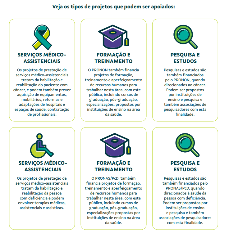 O doador pode destinar até 1% do seu IR para projetos do Programa Nacional de Apoio à Atenção Oncológica (Pronon) e mais 1% para projetos do Programa Nacional de Apoio à Atenção da Saúde da Pessoa com Deficiência (Pronas/PcD) aprovados pelo Ministério da Saúde.