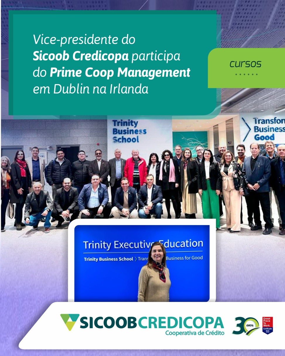 Nesta semana, a vice-presidente do Sicoob Credicopa Simone Braga de Queiroz bicalho participa da quarta turma do Prime Coop Management que está na Trinity College Dublin, na Irlanda, uma das mais antigas universidades da Europa Ocidental. A instituição é duplamente credenciada (EQUIS / AMBA) e considerada uma das melhores escolas de negócios do mundo.