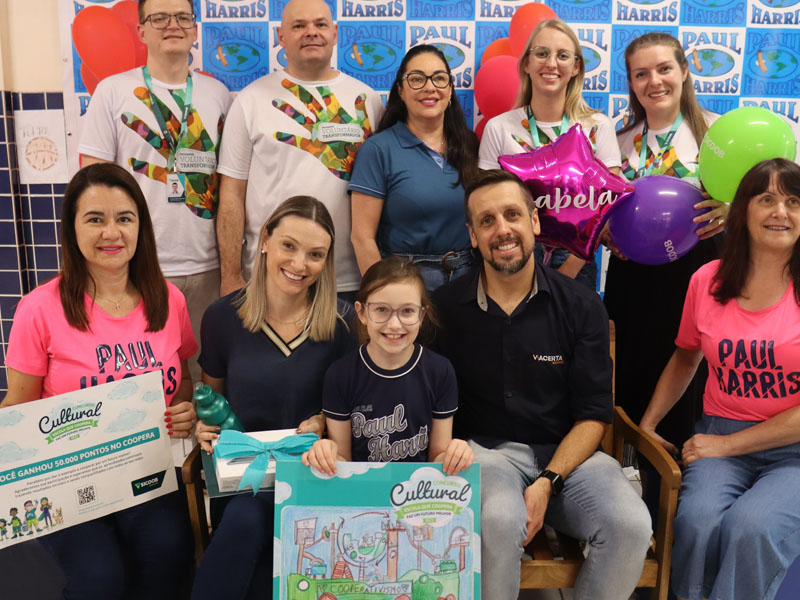 A aluna Isabela Nedel Silva, do 3° ano da Escola Municipal de Ensino Fundamental Paul Harris, de Santa Rosa (RS) foi a vencedora da Etapa Regional SC/RS do Concurso Cultural 2023 na categoria Desenho. Com o tema “escola que coopera faz um futuro melhor”, a fase teve a participação de mais de 27 mil estudantes. Com essa conquista, Isabela recebeu um tablet e sua professora R$ 1 mil em Pontos Coopera.