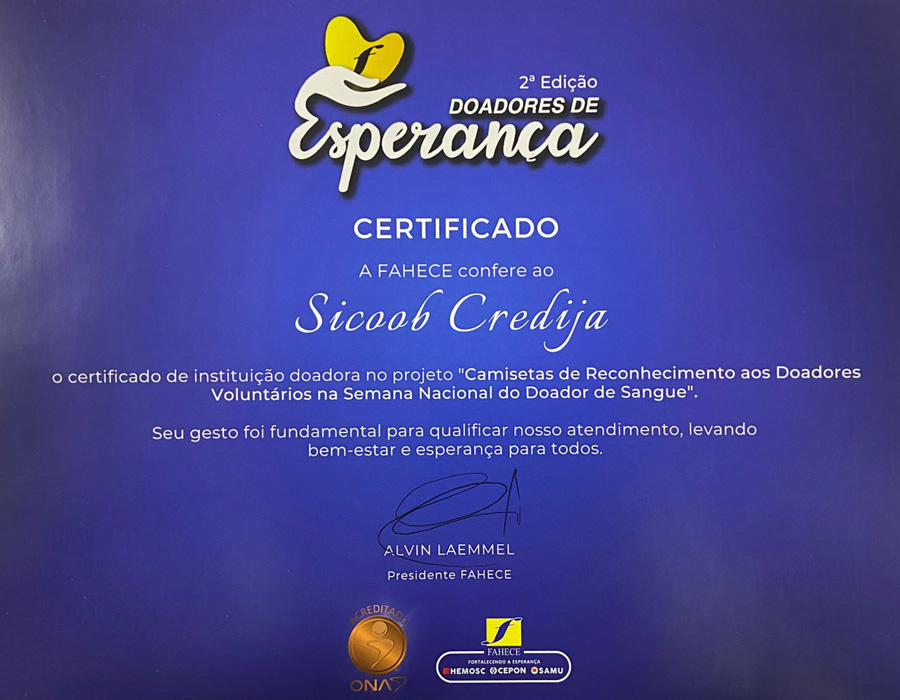 Os homenageados, incluindo o Sicoob Credija, receberam um certificado de "Doador de Esperança", um selo que atesta a colaboração de cada instituição, empresa e parlamento com a missão da Fahece. O evento reconheceu o Sicoob Credija pelo engajamento no projeto "Camisetas de Reconhecimento aos Doadores Voluntários na Semana Nacional do Doador de Sangue". O certificado recebido destaca a importância do gesto do Sicoob Credija, descrevendo-o como fundamental para qualificar o atendimento, levando bem-estar e esperança a todos os beneficiados.