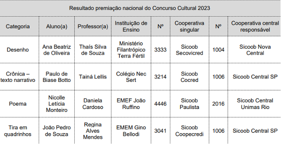 Dezembro de 2023 - Com o propósito de promover a construção de conhecimentos sobre cooperação e a percepção a respeito de realidades próximas, o Instituto Sicoob promoveu a 12ª edição de seu Programa Concurso Cultural, que contou com a participação de mais de 280 mil alunos inscritos (um aumento de 82% em comparação ao ano passado).