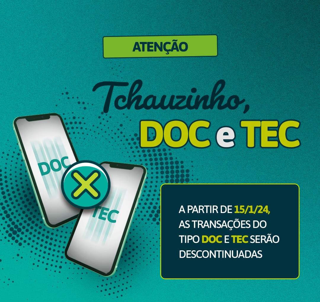 Informamos que, em cumprimento à determinação do Banco Central do Brasil e conforme Comunicado nº FB-034/2023 da Febraban, os serviços de DOC (Documento de Ordem de Crédito) e TEC (Transferência Eletrônica de Valores entre contas do mesmo banco) serão descontinuados a partir de 15/1/2024, inclusive para arquivos recebidos no layout CNAB.