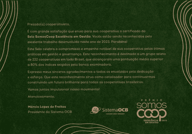 Na última segunda-feira (11/12), o Sicoob Coopere, representado pela Presidenta Maria Vandalva Oliveira, recebeu o prestigioso Certificado de Excelência no "Prêmio SomosCoop Excelência em Gestão, ciclo 2023", promovido pelo Sistema OCB.