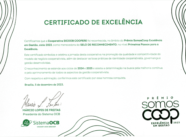 Além desse feito, o Sicoob Coopere também foi merecedor do Selo de Reconhecimento no nível Primeiros Passos para a Excelência, um reconhecimento motivo de orgulho que estende-se de maneira destacada não apenas ao presente ciclo, mas projeta-se com relevância para os anos de 2024 e 2025.