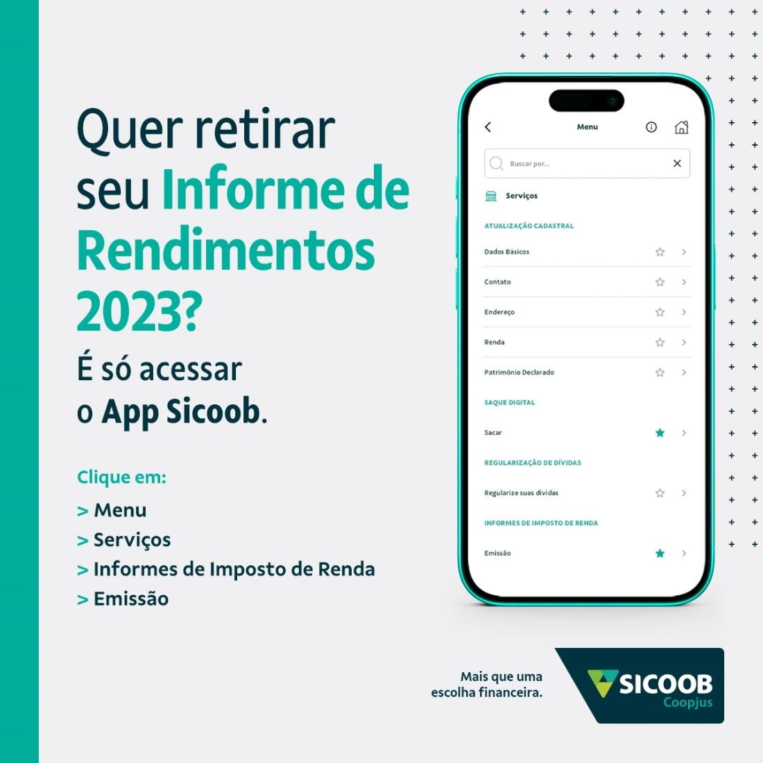 O informe de rendimentos dos cooperados, tanto pessoas físicas quanto jurídicas, referentes ao ano fiscal de 2023, já está disponível no aplicativo Sicoob. Para acessá-lo, basta abrir o APP em seu smartphone e seguir estes passos simples: Menu > Serviços > Informes de Imposto de Renda > Emissão.