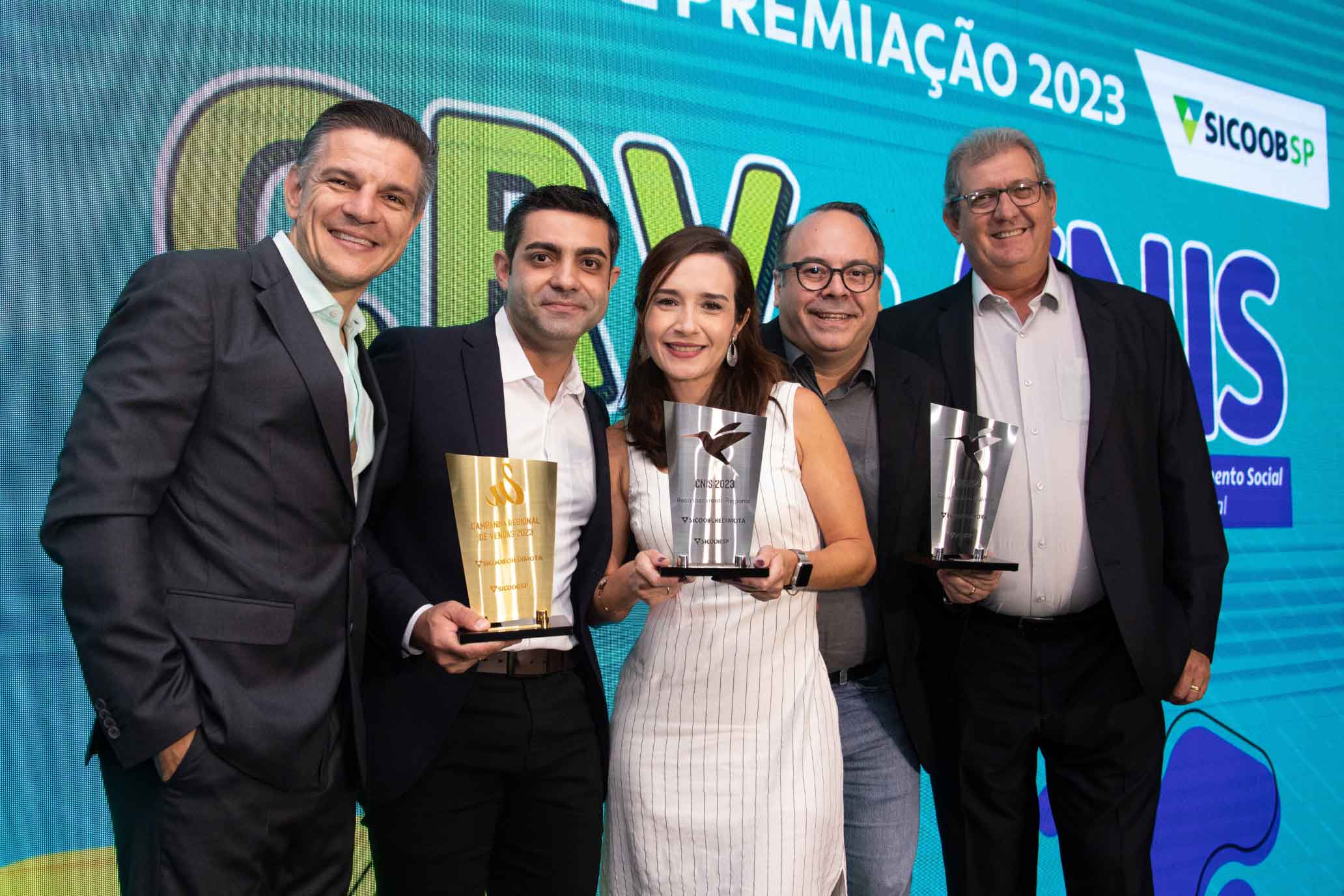Representaram o Sicoob Credimota na premiação, o presidente do Conselho de Administração, Valdir Martins, o diretor Administrativo e de Riscos, Allan Cirelli Coppede, o diretor Financeiro, Pedro Sérgio do Carmo, o diretor de Negócios, Vinícius Grego Barbosa, além dos colaboradores da área de Estratégia de Negócios, Michel Carvalho da Silva, e Comunicação e Marketing, Daniela Pinheiro.