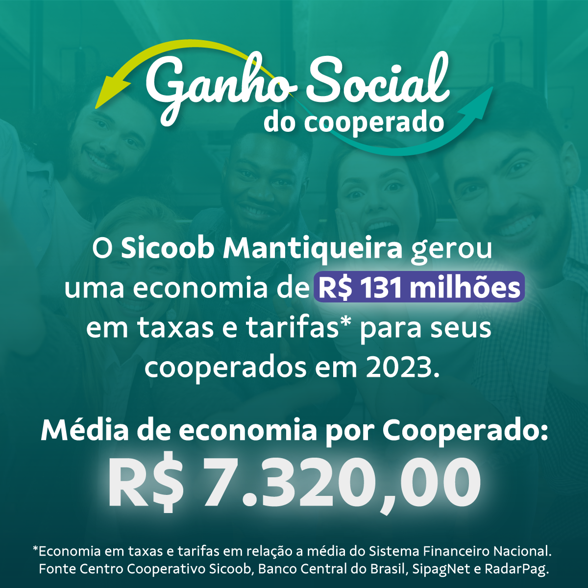 O ganho social proporcionado pelo Sicoob Mantiqueira em 2023 foi notável. Os resultados do Ganho Social é um indicador anual, revelam o quanto os cooperados economizam em taxas e tarifas em comparação com os bancos tradicionais.