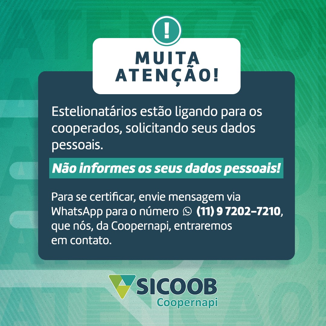 A Cooperativa de Crédito do Sindicato Nacional dos Aposentados, Pensionistas e Idosos – Coopernapi informa tratar-se de golpe ligações para aposentados, usando o número da instituição, para pedir confirmação de dados. Ao receber esse tipo de ligação, o cooperando deve desligar o telefone e não fornecer informações. A Coopernapi não faz contato telefônico para informar problemas em contas correntes e muito menos para pedir confirmação de dados.