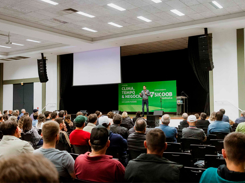 As mudanças climáticas podem afetar diretamente as atividades de agricultores e produtores rurais. Pensando nisso, o Sicoob Credisulca promoveu o evento 'Clima, Tempo e Negócios'. Realizado no Centro de Eventos de Turvo, o encontro contou com a palestra do meteorologista Leandro Puchalski e reuniu em torno de 300 agricultores da região.