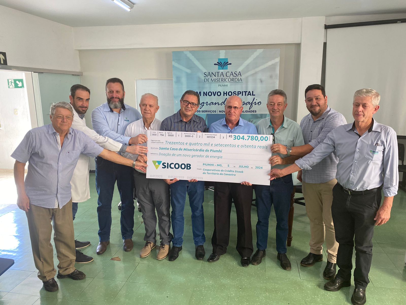 Quatro cooperativas do Sicoob do Território da Canastra realizaram a entrega de um cheque simbólico no valor de *R$ 304.780,00* à *Santa Casa de Misericórdia de Piumhi nesta sexta-feira (05/07). A doação será destinada à compra de um gerador de energia, que suprirá as necessidades da entidade e permitirá a futura instalação do setor de hemodiálise, beneficiando toda a região.