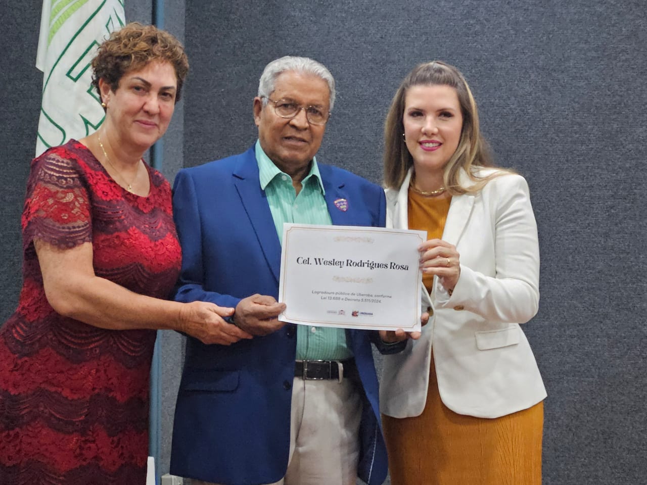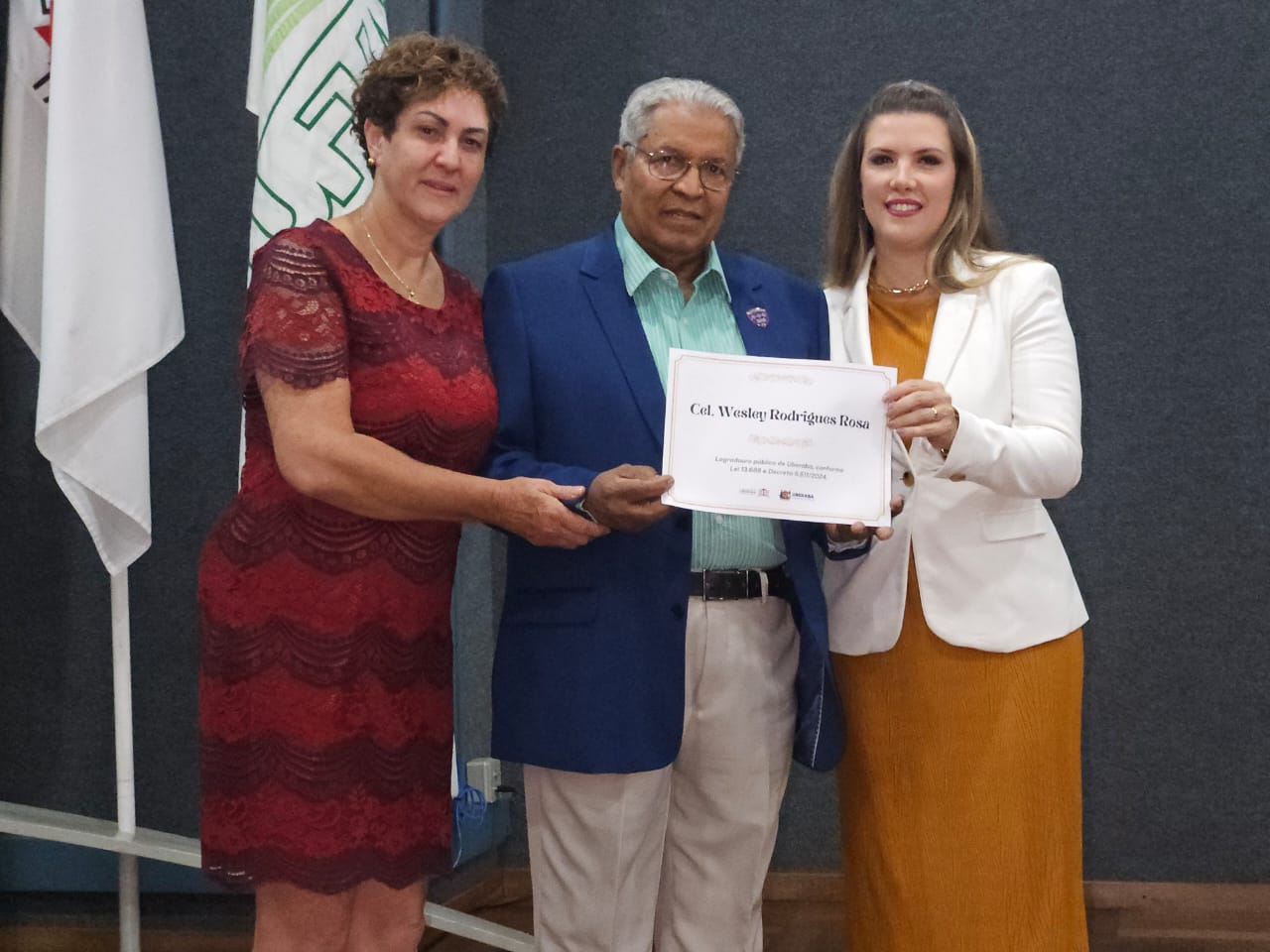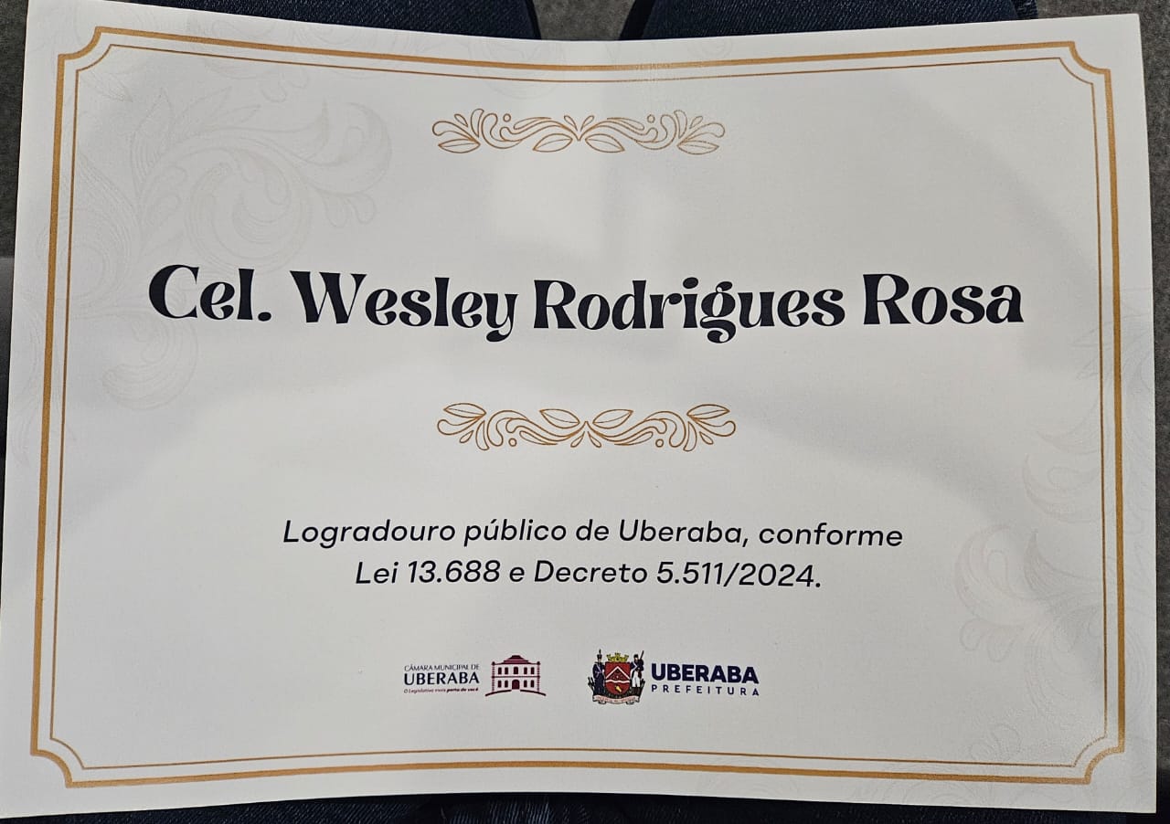 Na ocasião, representantes da Prefeitura de Uberaba entregaram um certificado conforme o Decreto Nº 5.511 de 13 de Março de 2024, da Lei Orgânica do Município, juntamente com o Decreto nº 2672, de 08 de abril de 2011, e o Decreto nº 2617, de 18 de julho de 2014, que designou a Rua 04 com o nome de Cel Wesley Rodrigues Rosa, em homenagem ao Cel PM que faleceu em 07 de Março de 2021, vítima da COVID-19.