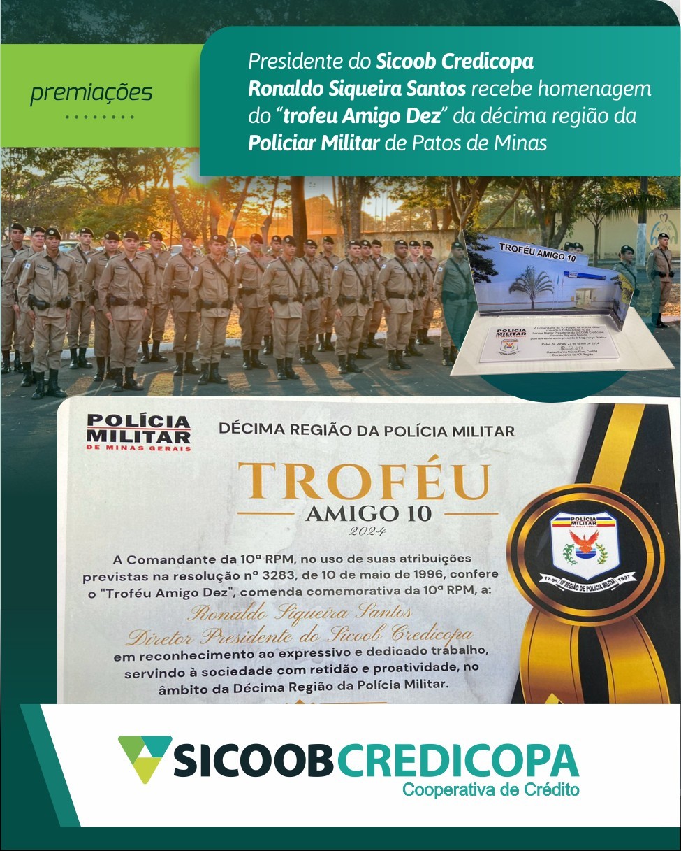A Comandante da 109ª RPM, no uso de suas atribuições previstas na resolução n° 3283, de 10 de maio de 1996, confere o "Troféu Amigo Dez", comenda comemorativa da 10° RPM, ao Presidente do Sicoob Credicopa Ronaldo Siqueira Santos em reconhecimento ao expressivo e dedicado trabalho, servindo à sociedade com retidão e proatividade, no âmbito da Décima Região da Polícia Militar.
