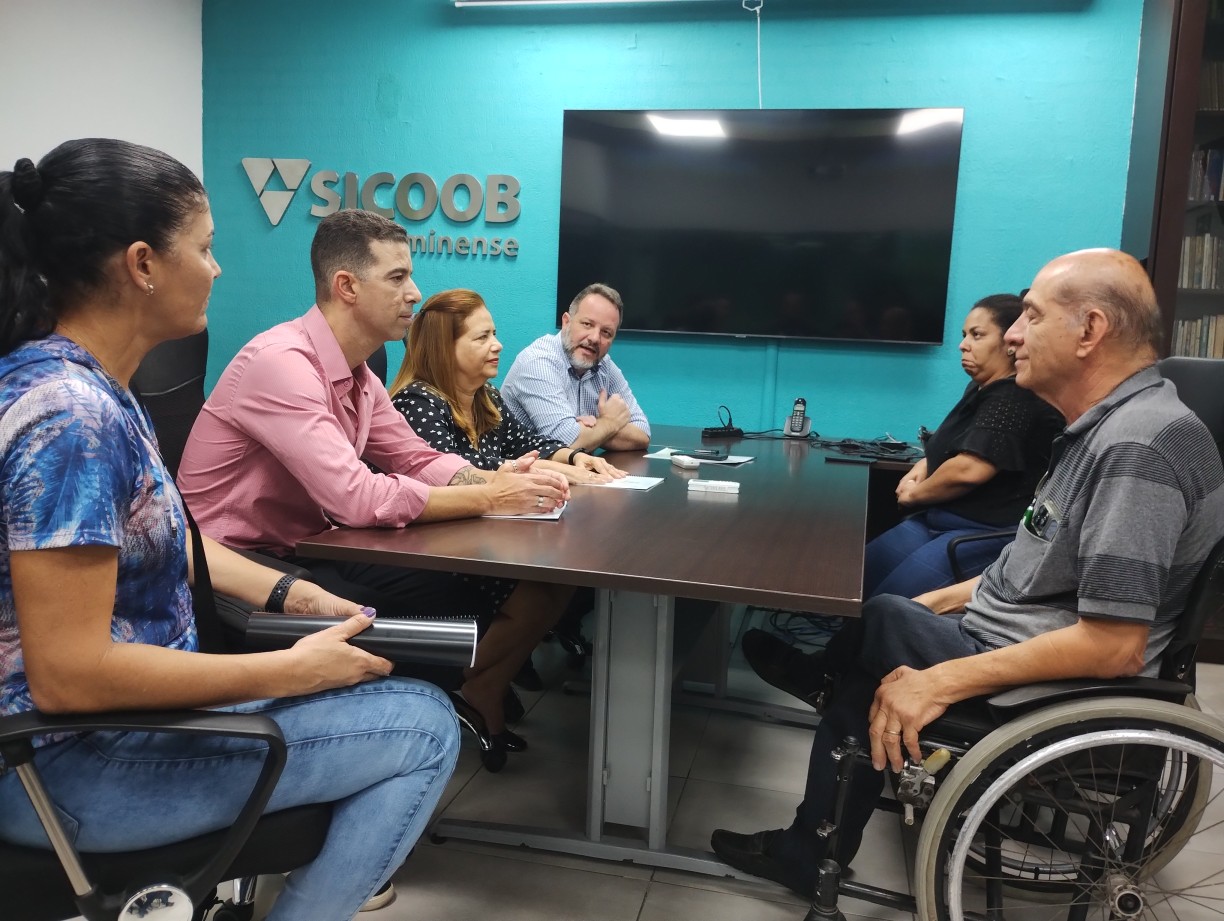 Vítor Saraiva, Reitor; Márcia Crisóstomo, Pró-Reitora de Políticas Estudantis; Josemara Peçanha, Diretora de Formação Integral; Leonardo Basílio, Coordenador de Políticas Esportivas de Educação Física e Saúde e André Dias, Coordenador de Educação Física do campus Campos Centro do IFF, foram recebidos pelo Diretor Operacional Marcos Lincoln e pelo Diretor Presidente do Sicoob Fluminense, Neilton Ribeiro da Silva.