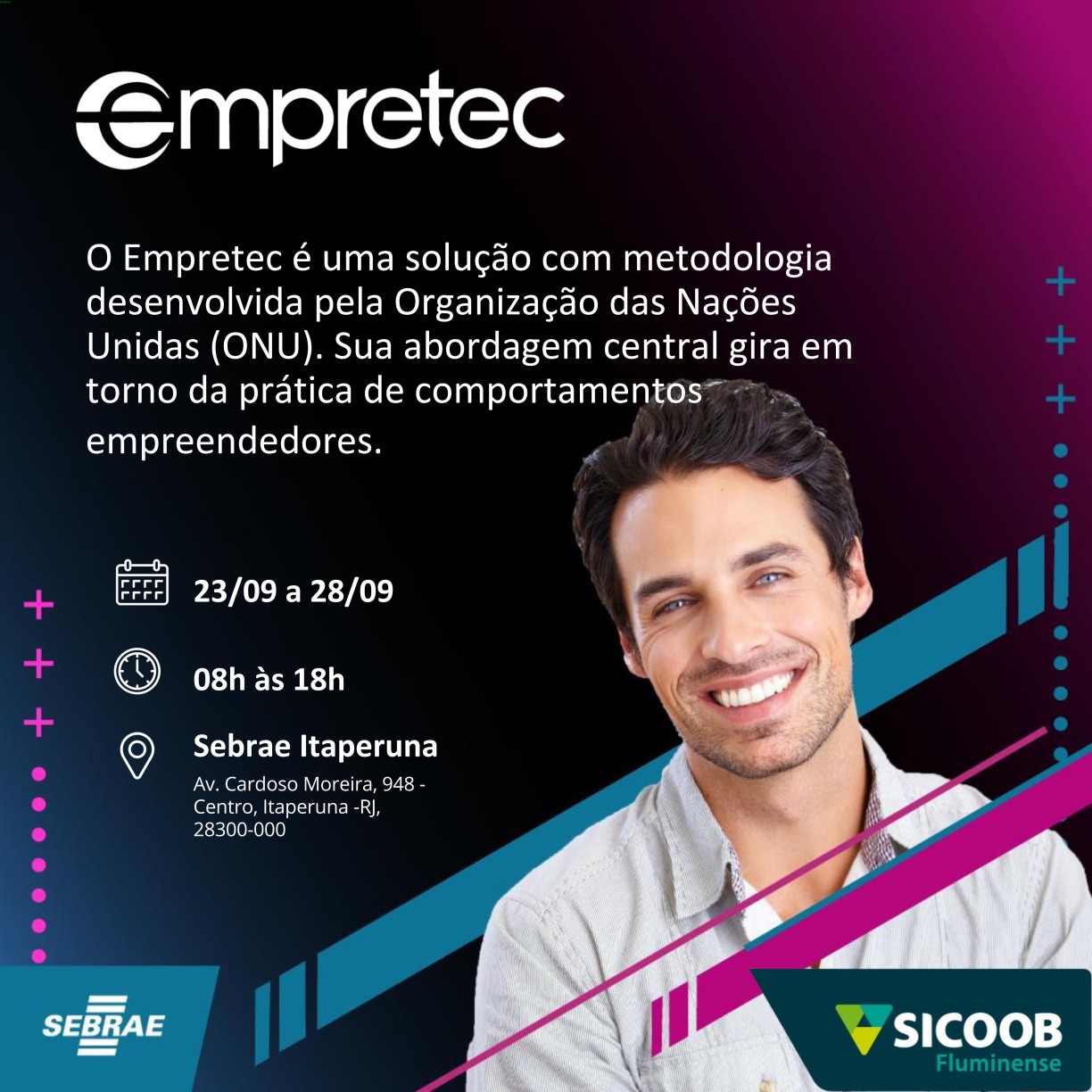 O Sicoob Fluminense está apoiando mais uma etapa do Empretec, desta vez em Itaperuna, no Noroeste Fluminense, voltado para empresários da região. O evento, promovido pelo Sebrae/RJ acontece na semana de 23 a 28 de setembro, das oito às 18h, na agência do Sebrae em Itaperuna, na avenida Cardoso Moreira, 948, Centro.